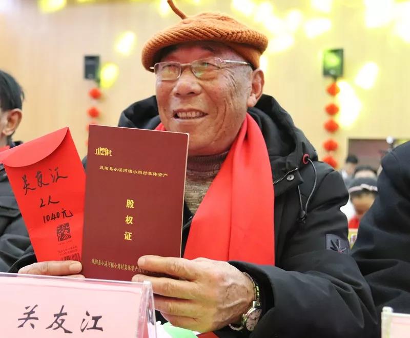在分红大会现场,小岗村民由于日子越过越过越红火展现出灿烂的笑容。村民们手拿着《凤阳县小溪河镇小岗村集体资产股权证》,每人领到集体经济收益股权分红520元,领到的分红一年比一年多,让小岗村民有了实打实的获得感、幸福感。小岗村自2016年以来开展的集体资产股份合作制改革和农村“三变”改革(“资源变资产、资金变股金、农民变股东”)。经过成立组织、清产核资、成员身份界定、配置股权,小岗村成立集体资产股份合作社并发放股权证,村民实现了对村集体资产的“人人持股”,并连续两年“人人分红”。2018年是改革开放40周年,与上一年相比,小岗集体经济收入渠道更宽了,包括控股、参股的相关公司利润分成、小岗品牌使用费、广告收入、旅游收入、培训产业收入等,已从820万元增加到2018年的1020万元。小岗村根据集体资产股份合作社收益较好的情况,经过今年1月24日村民代表大会表决通过,4361名村民作为股东可分红226.77万元,每个村民可获得分红520元。2017年度小岗村实现首次分红,每个股民分红350元。