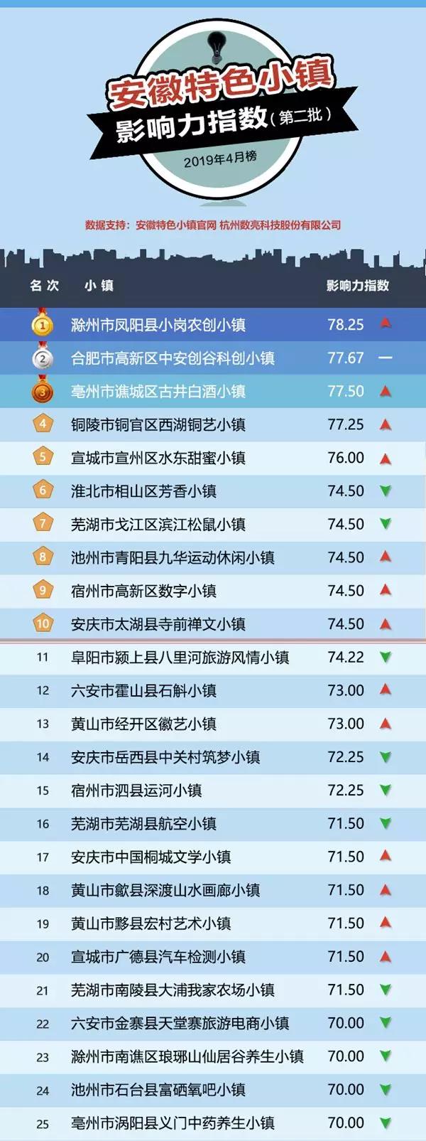 《安徽省第二批特色小镇影响力指数4月榜单》的统计时间为2019年4月1日至4月30日,展示了安徽省第二批25个特色小镇网络影响力的排名情况。与上月相比,本期榜单的第一和第三名发生了较大变化,分别由滁州市凤阳县小岗农创小镇和亳州市谯城区古井白酒小镇摘得,它们也成为了榜单前十名中进步最大的两个小镇。此外,合肥市高新区中安创谷科创小镇继续保持榜眼位置。
