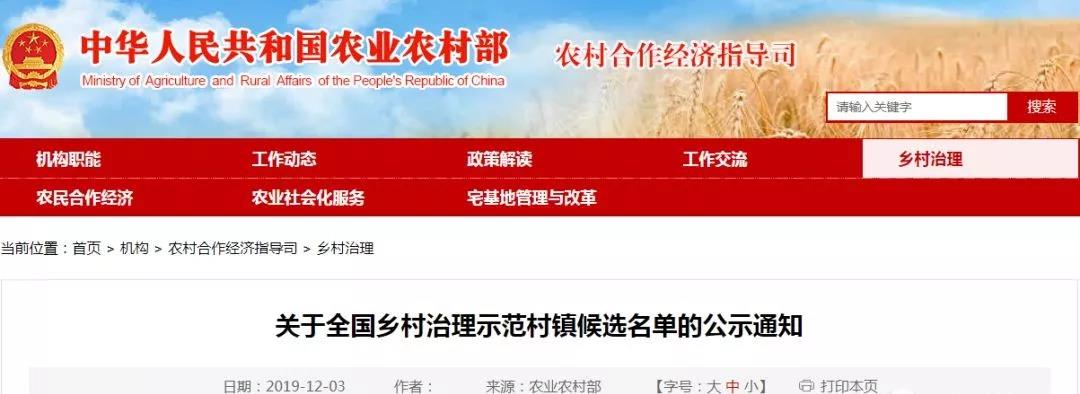 关于全国乡村治理示范村镇候选名单的公示通知
