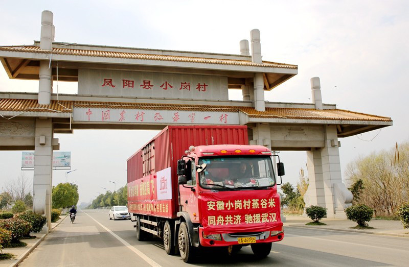 2月24日上午,由凤阳县小岗村村两委和全体村民以及小岗安徽蒸谷米食品科技有限公司共同捐赠的12吨价值40万元的蒸谷米装车起运,千里驰援武汉,并定向发往湖北省人民医院、武汉大学中南医院等新冠肺炎病例定点收治医院,向奋战在战“疫”一线的白衣战士表达崇高的敬意和坚定地支持。物资起运前,县委常委、组织部长刘吉昌,小岗村党委第一书记李锦柱等为前往武汉的人员送行。